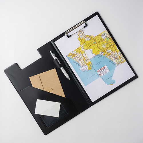 A4サイズの2ツ折バインダー。中面に書類や名刺をはさめます。