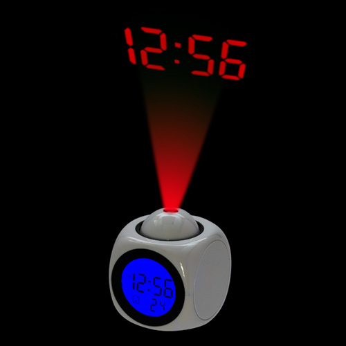 アタマの丸いスイッチを押すと音声で時刻をお知らせ。プロジェクターライト機能もついています。