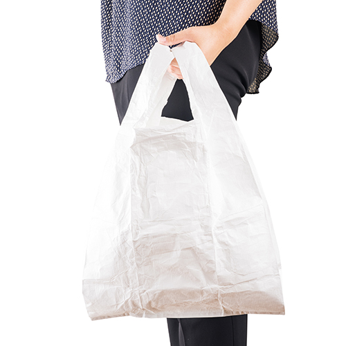 軽くて強靭、耐久性と耐水性に優れた素材です。また、キャンバス生地やコットンに比べ軽量な為、輸送の際のエネルギーの使用量を抑えることができます。また、リサイクルが可能な高密度ポリエチレン(HDPE)製ですが、やむを得ず焼却した場合でも、最適な条件下では水と二酸化炭素のみ放出し、残留物を残さないため、環境に配慮された素材になります。SDGsに貢献できるノベルティとして最適です。本体を収納できる便利なポケット付きなので、持ち運びしやすくショッピングバッグになります。