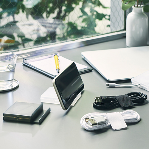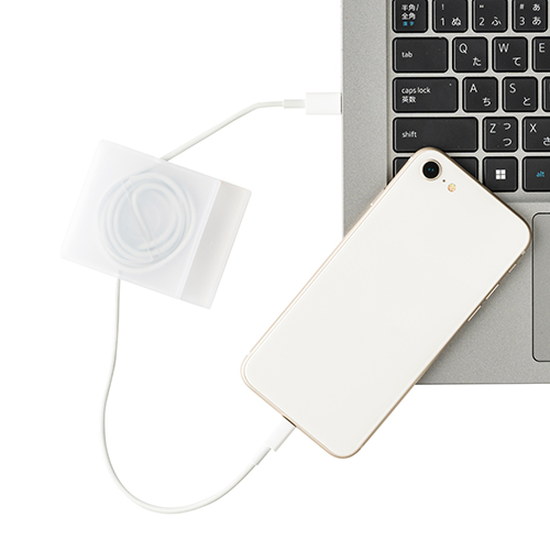 絡まりがちな充電用のコードを簡単にまとめられるアイテムです。本体にコードをセットしつまみを回すだけでコードを巻き取ることができ、きれいに収納できます!スマホスタンドも付いているので動画を楽しみながら充電ができます。販促用のノベルティとして人気なアイテムです。