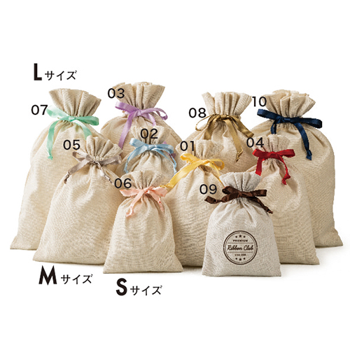 10色のリボン展開があり、ブランドイメージに合わせることができます。ラッピング、ノベルティとしての実用性はもちろん、ポーチ代わりに普段使いもできる万能の巾着です。Mサイズはトラベルポーチとしてちょうどよいサイズ感です。