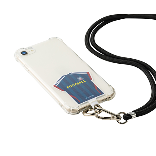 スマートフォン本体とスマートフォンケースの間に挟み込むようにして挿入することで、キーホルダーやストラップを取り付けられるようになり、ネックストラップを装着すればショルダータイプのスマートフォンケースとしても利用できるようになります。Tシャツ型に印刷を載せることでスポーツグッズやライブグッズとして活用いただけます。